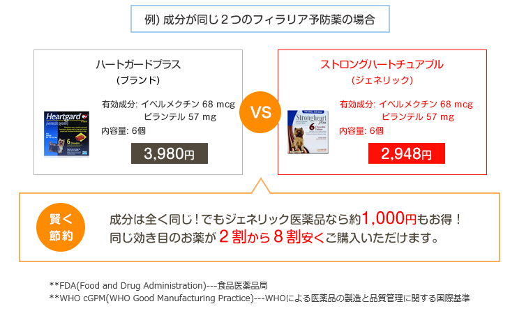 しかし、ペットくすりで取り扱われている医薬品は海外で製造されている安いものが多いです。さらに、日本では販売されていないジェネリック医薬品なども豊富に取り揃えられているので、大変安くペットの薬をそろえることができます。